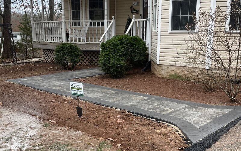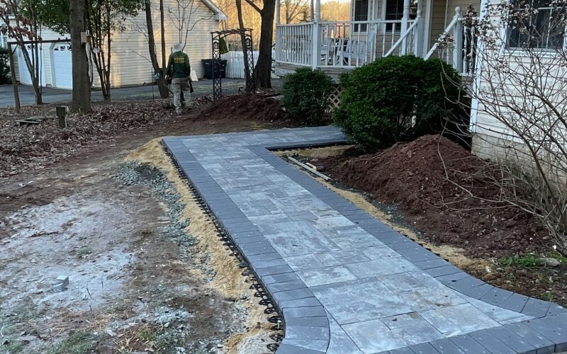 For the walkway in Phase 1, we excavated the existing path and put down our filter fabric, 4 inches of 21A gravel that we then compacted, and 1 inch of concrete sand. Then we installed the pavers and paver edging and, lastly, applied polymeric sand. We used Nicolock-brand pavers of the Stone Ridge and Stone Ridge XL type. The customers chose Granite City for the paver color. For the border, we used Ridgebrick brand pavers the color Charcoal. Finally, we put an inch of stone dust as the base and leveled it out to ensure the steppers will not settle or move. Over the course of all three phases, the total price was between $30k-$33k. We also perform our lawn care fertilizer program for this customer, but the above price range does not include the price of these services.