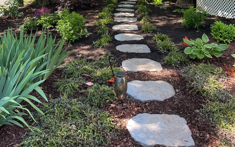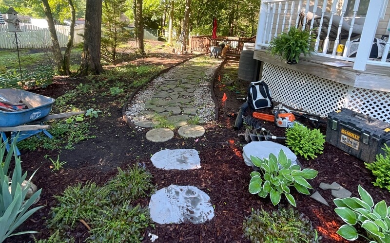 We constructed a paver walkway and created a beautiful garden near this walkway, along with removing a large tree to allow more sunlight for the plants and to drive away the moss.